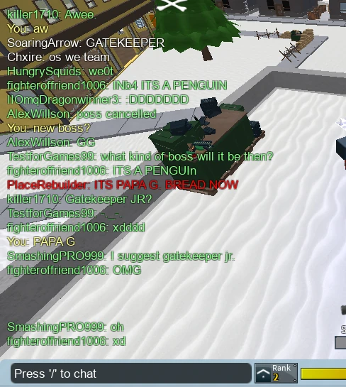Previously, Papa G. Bread was rumoured to be the replacement to the cancelled Rhi-snow boss during the Christmas Event 2016 after PlaceRebuilder said publicly while playing a server: "[IT'S] PAPA G. BREAD NOW." However, the idea was scrapped, so Rhi-snow was brought back.